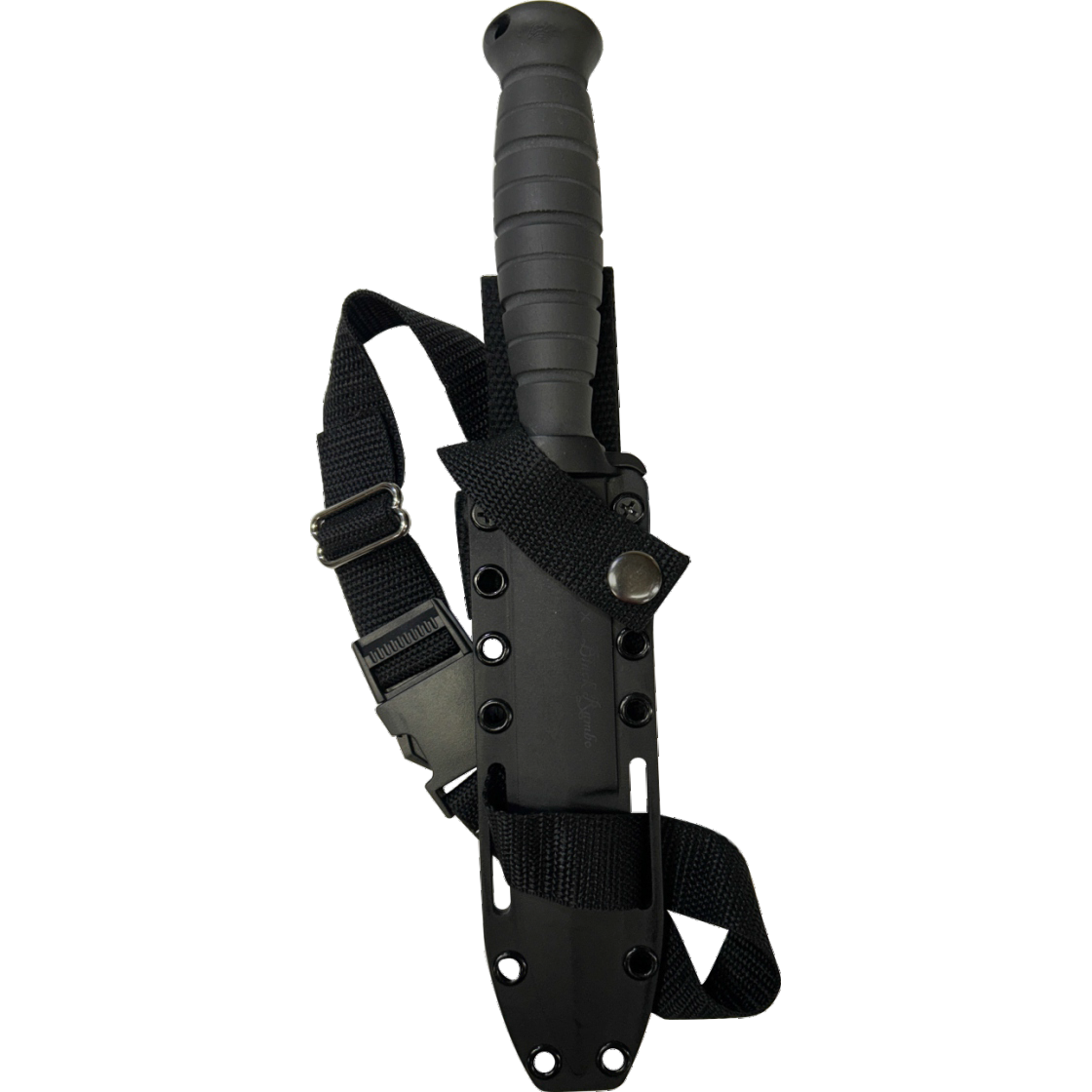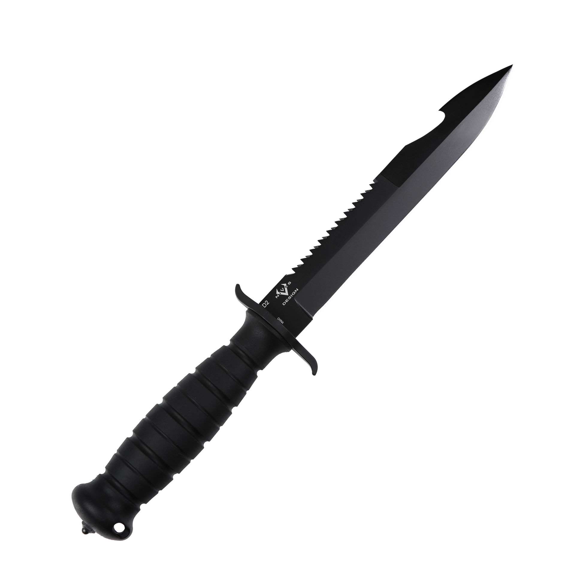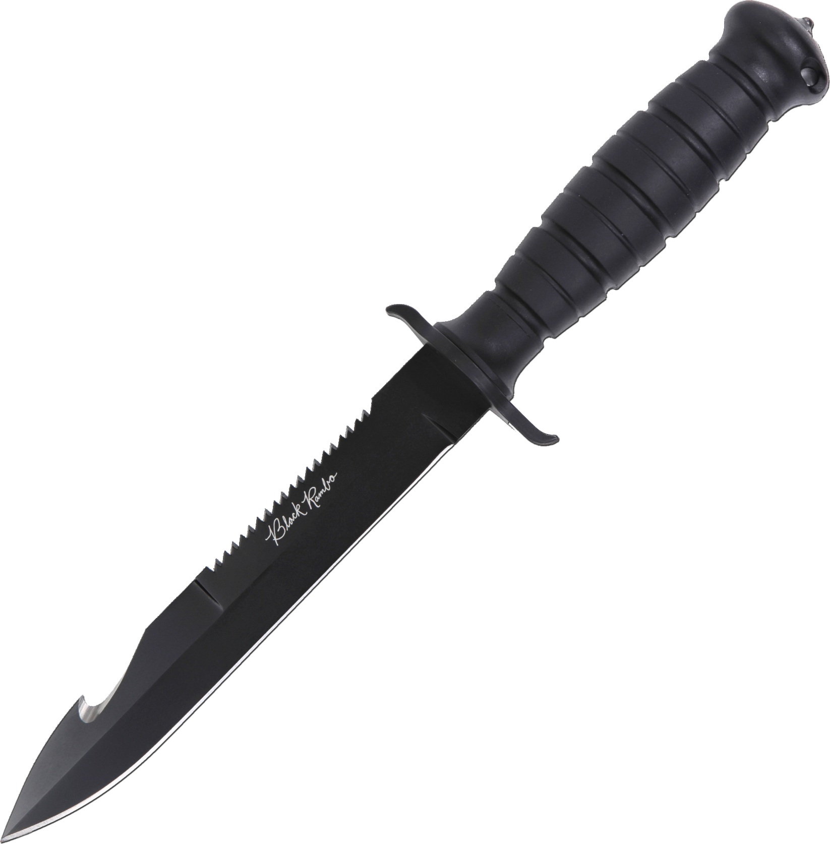 The Black Rambo Savage is a slim version of a combat knife but no less effective! Featuring a saw on the spine as well as a gut hook/line cutter going towards the tip. The FRN & TRP handle provides great grip and comfort at the same time as well as featuring a glass breaker on the butt and a lanyard hole for paracord or any other material you may want to thread through.