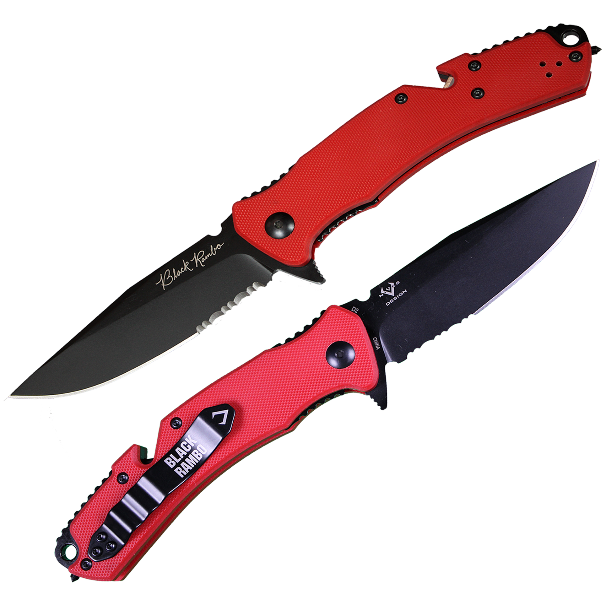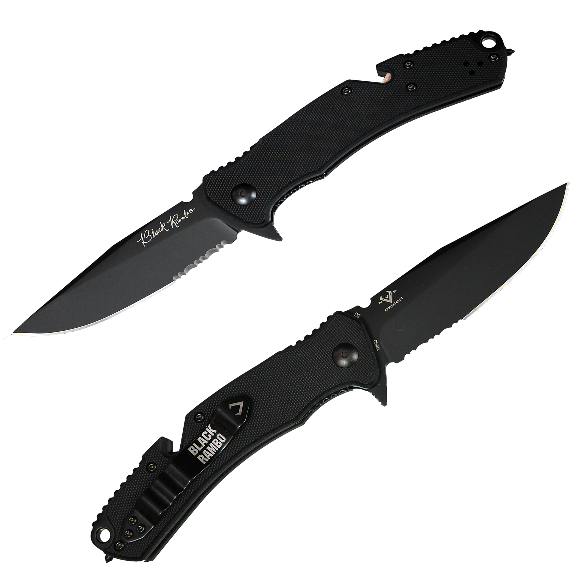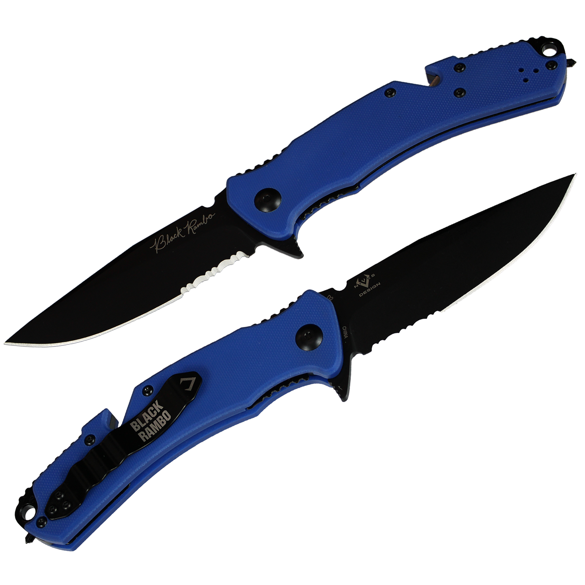 The Black Rambo Utility Pro Knife is a folding knife that has either G10 or FRN handles available in 3 colors (black, blue and red). This flipper deployment knife has either a D2 (G10 only) or 420HC (FRN only) blade, flat grind, PVD black coating, a fire strike notch, and a clip point. Additional features are a strap cutter, a glass breaker (G10 only), a lanyard hole and a pocket clip (switchable on G10 only).
