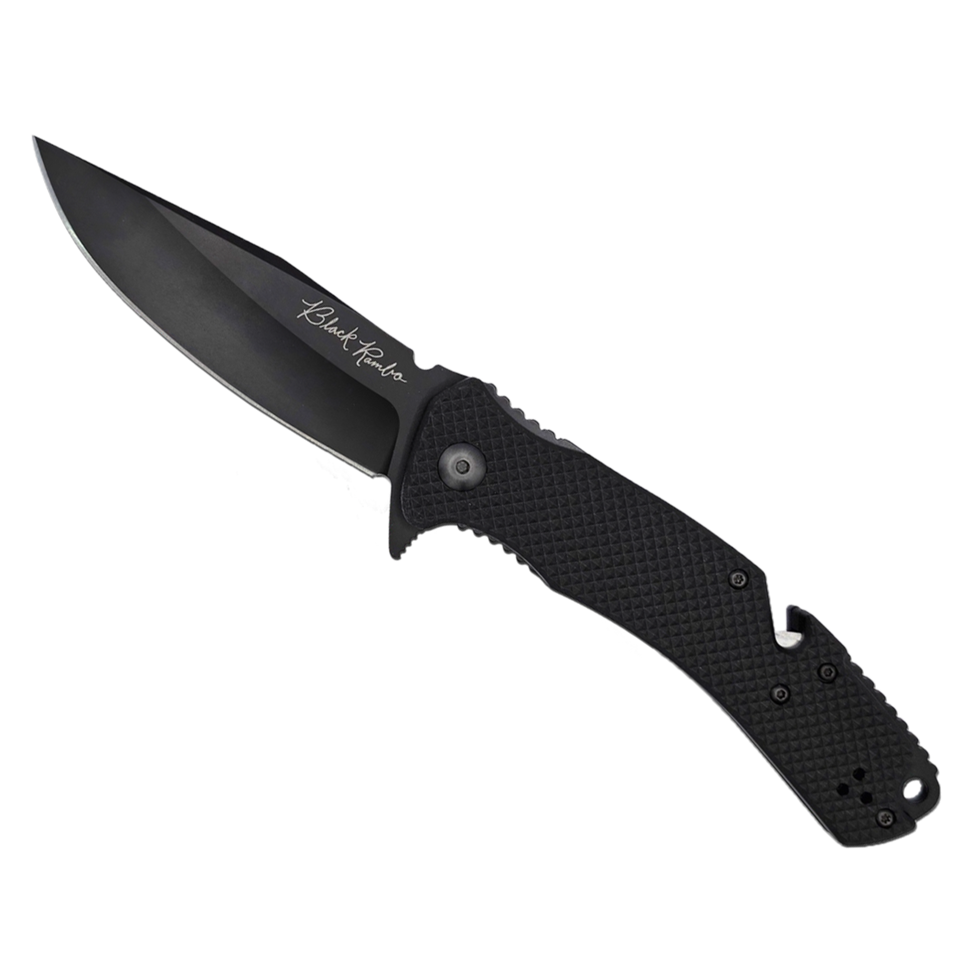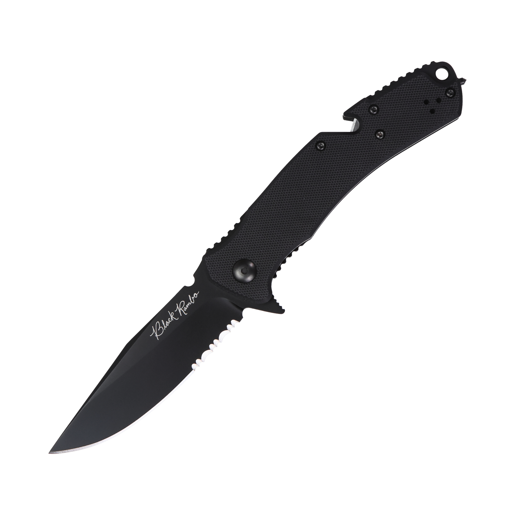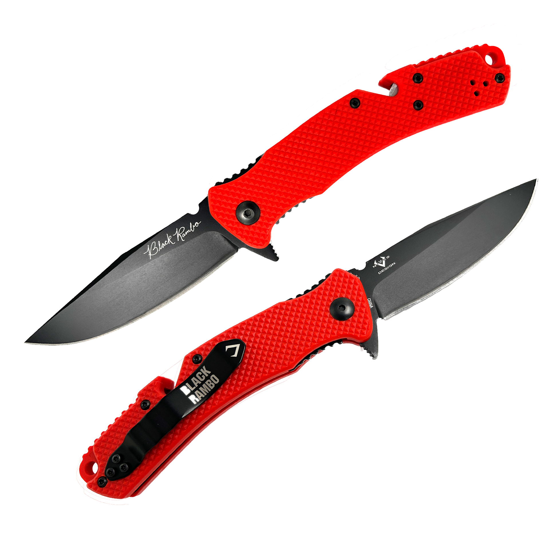 The Black Rambo Utility Pro Knife is a folding knife that has either G10 or FRN handles available in 3 colors (black, blue and red). This flipper deployment knife has either a D2 (G10 only) or 420HC (FRN only) blade, flat grind, PVD black coating, a fire strike notch, and a clip point. Additional features are a strap cutter, a glass breaker (G10 only), a lanyard hole and a pocket clip (switchable on G10 only).